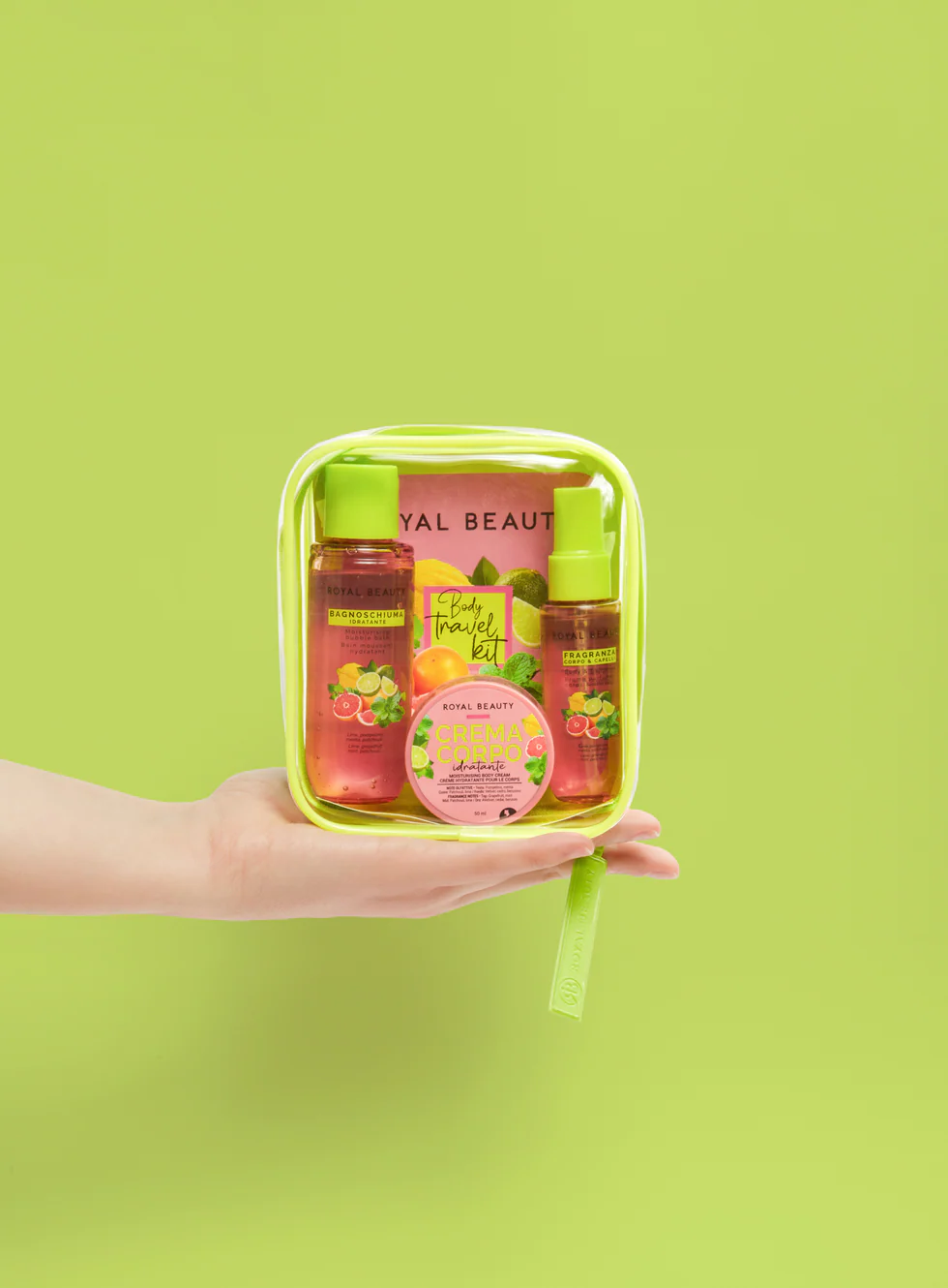 Një frymë freskie energjike për trupin dhe flokët. Ky komplet shumëngjyrësh udhëtimi përfshin një krem, mjegull për trupin dhe flokët dhe larjen e trupit.